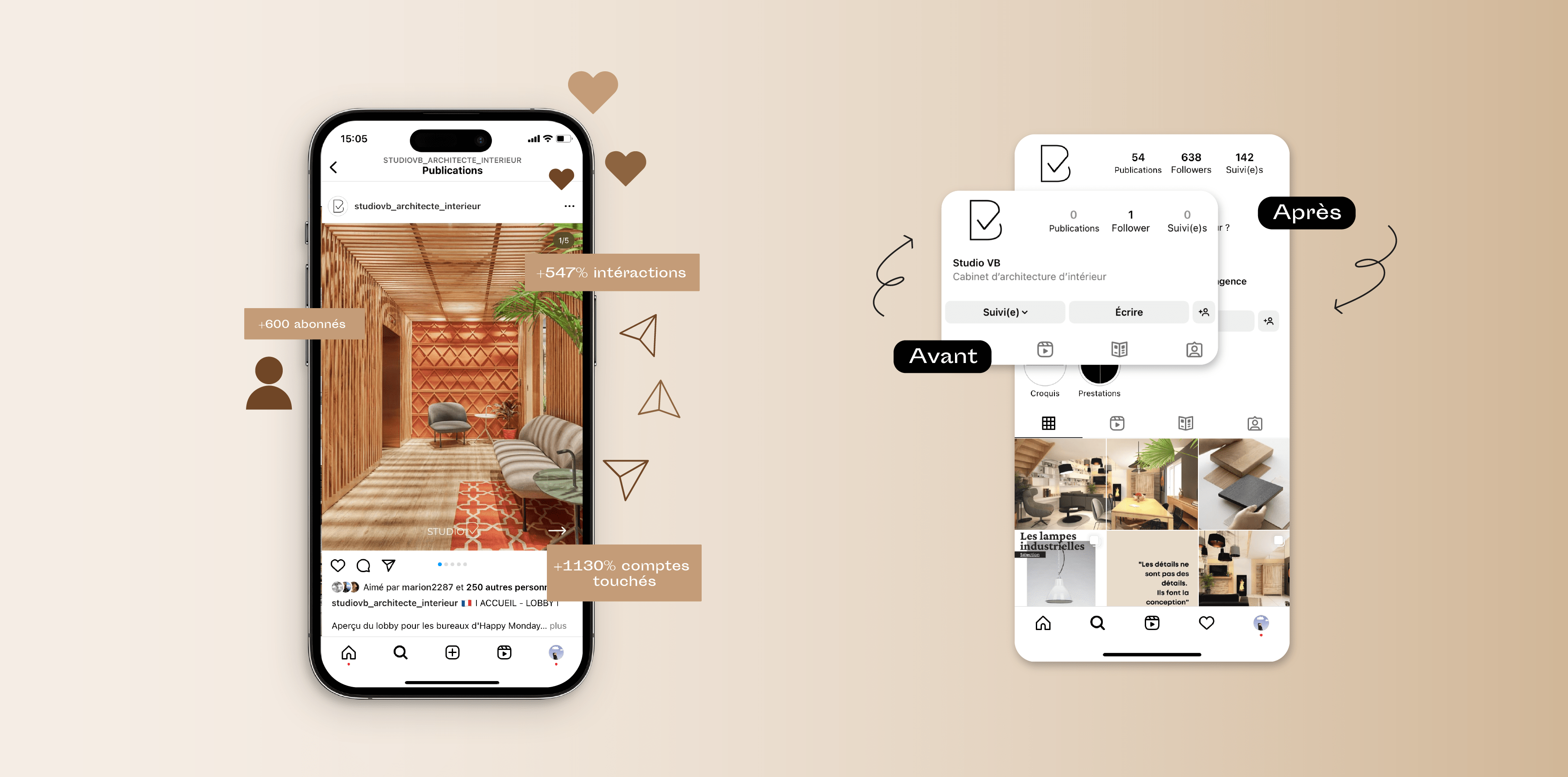 En attendant la création de son site internet, le studio VB avait besoin de se faire connaître rapidement et de signer des premiers contrats sur le territoire rennais. Il souhaitait donc créer un tout nouveau compte Instagram pour présenter l'ensemble de leurs projets ainsi que leurs prestations.